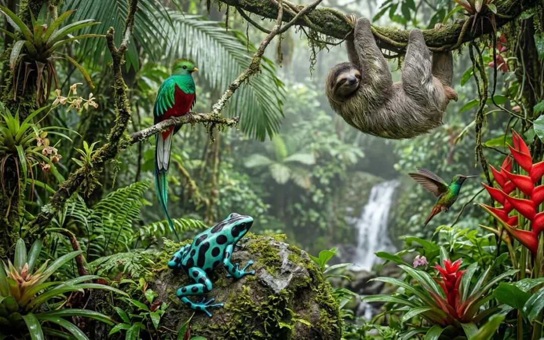 Entre 900 et 1 000 espèces d’oiseaux ont été recensées au Costa Rica, soit entre 3 et 10 % des espèces mondiales — dans un pays représentant 0,03 % de la surface terrestre. Parmi elles, le quetzal resplendissant trône en majesté. Son plumage vert émeraude, son ventre rouge écarlate et ses plumes caudales pouvant dépasser 1 mètre chez le mâle en font l’un des oiseaux les plus spectaculaires du monde. Il vit entre 1 000 et 2 000 mètres d’altitude, était vénéré par les civilisations précolombiennes à travers le dieu aztèque Quetzalcoatl, et reste en voie d’extinction.